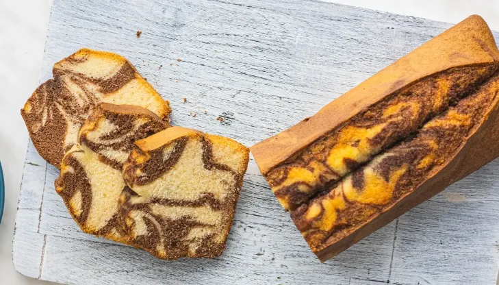 В форму выливайте поочередно светлое и темное тесто ложками, создавая узор «зебра».